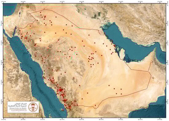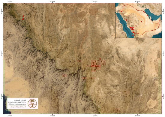 Previous records: Mahazat as Sayd [8,55,56], Saja/Umm Ar-Rimth, Mahazat as Sayd Reserve [12], Uruq Bani Ma’arid [15], Ashayrah [24], Harrat al-Harrah [26,57], Al Zetah, Haqel, Rowafah [28], Sharri [58], Bisha [29]. Saja/Umm Ar-Rimth protected area [32], between Sarrar and Al Uwaynah, Rumah [36], Riyadh [59], Turif [54].