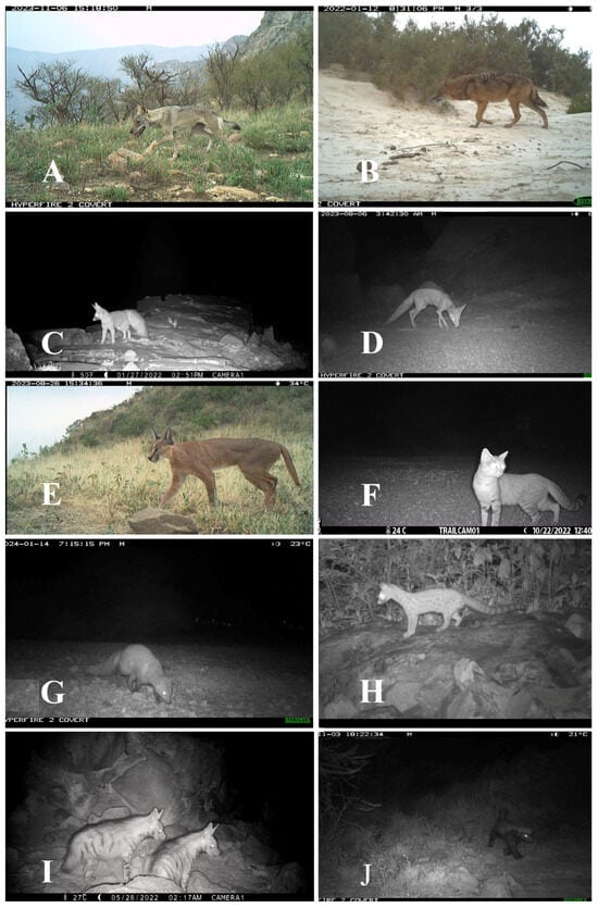 (A) Canis lupus. (B) Canis aureus. (C) Vulpes cana. (D) Vulpes vulpes. (E) Caracal caracal. (F) Felis lybica. (G) Ichneumia albicauda. (H) Genetta genetta. (I) Hyaena hyaena. (J) Mellivora capensis. (All photos by NCW).