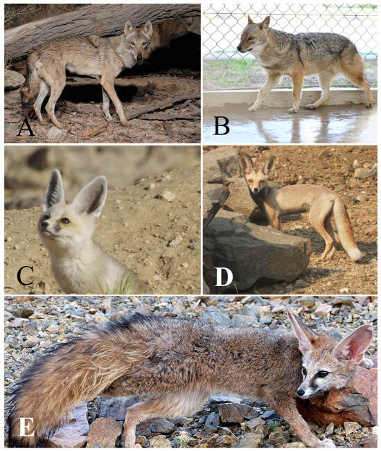 (A) Canis lupus (NCW). (B) Canis aureus (NCW). (C) Vulpes rueppellii (NCW). (D) Vulpes vulpes (NCW). (E) Vulpes cana (Photo by A. Aloufi).