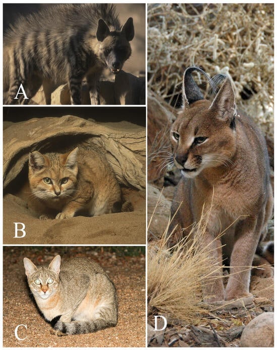 (A) Hyaena hyaena (NCW archives). (B) Felis margarita (NCW archives) . (C) Felis lybica (NCW archives). (D) Caracal caracal (NCW archives).