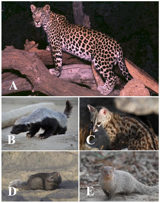 (A) Panthera pardus nimr (NCW). (B) Mellivora capensis (NCW). (C) Genetta genetta (NCW). (D) Ichneumia albicauda (NCW). (E) Herpestes edwardsii (Photo by M. Al Zayer).