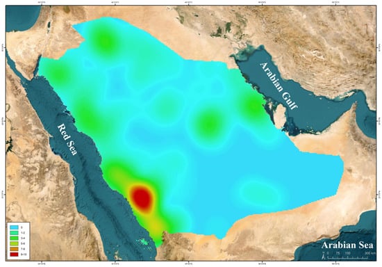 Previous records: Al Harrah, Aljubeh, Alwidyan, An Nafud, Khaw’s village, Laija [23], Bani Sar, Biljurshi, Jabal Ayn Dar, Jabal Burrayman, Jabal Lidam, Jabal Qidam, Makkah, Masane, Namrah, Taif Shafa, Talhah, Wadi Qust, Wadi Turabah [24], Al Namas [25,43], Abu Rakah, Alagan, Al Desah, Bajdah, El Bedeaa, E Geal, Gumailah, Haqel, Harat Alrahah, Wadi Al Gshabreah [28], Bisha [29], Asir [34], Al Hasa, Al Medinah, Asir, Hejaz, Tubyeq [36], Hesam (W Tabuk), Jebel Al Lawz, Jebel Hijaz, Jebel Mayen, S Taif across the southwest and in northwest along the Tabuk [53], Turaif [54].