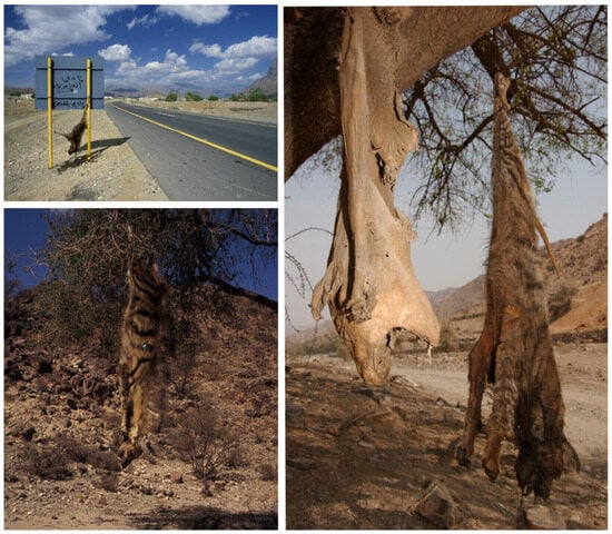 Remarks: The African wildcat occurs in rocky areas, scrub deserts, dunes, and plains from the sea level to 2300 m a.s.l. There are no detailed studies on the wildcat in Arabia except for a radio-tracking study of two animals in the UAE [63,64]. A wildcat was found resting in the hollow of a Ghaf tree Prosopis cinerea [65].