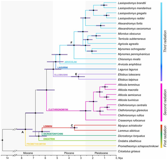For years, voles and lemmings (subfamily Arvicolinae) have remained some of the most difficult groups for disentangling evolutionary history and phylogenetic relations; consequently, the taxonomic structure at the super species level has remained poorly substantiated. The objective reason for the complexity of these tasks is the very fast explosive radiation of the subfamily since 7 million years ago (Ma) [1,2]. The first molecular studies involving one or a few markers allowed distinguishing repetitive radiation waves within Arvicolinae’s fast diversification [3], later on conditionally described as the three radiations [4]. These three radiation waves with constant tribe composition have been confirmed in subsequent papers with the addition of molecular markers and taxa [5,6,7]. In modern fauna, the first radiation is represented by four tribes: long-clawed mole voles (Prometheomyini), collared (Dicrostonychini) and true (Lemmini) lemmings, and muskrats (Ondatrini). The second radiation consists exclusively of forest and rock voles, which belong to the tribe Clethrionomyini. The third and last radiation is the most diverse and numerous, and includes three tribes, steppe voles (Lagurini), mole voles (Ellobiusini), and Arvicolini, with the water-vole (Arvicola Lacepede, 1799) and a dozen genera known under the common name, gray voles.