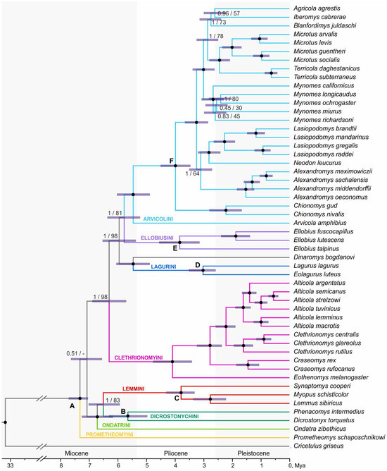 Time-calibrated phylogeny of Arvicolinae on the basis of the ddRADseq data. Node labels indicate BI or ML support levels. Black circles show nodes with BI support of 0.99–1.0 and ML support of 99–100. Node bars represent 95% highest posterior density (HPD) intervals of node heights. Letters A–F at nodes correspond to fossil constraints (Table S4). Tribes are distinguished by different branch colors.