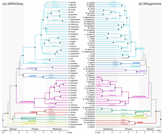 Comparison of results of ddRADseq (a) and mitogenome (b) analyses. Black circles show nodes with BI support of 0.95–1.0 and ML support of 95–100. Tribes are distinguished by different branch colors. Mitochondrial phylogeny summarized according to Abramson et al. [7].