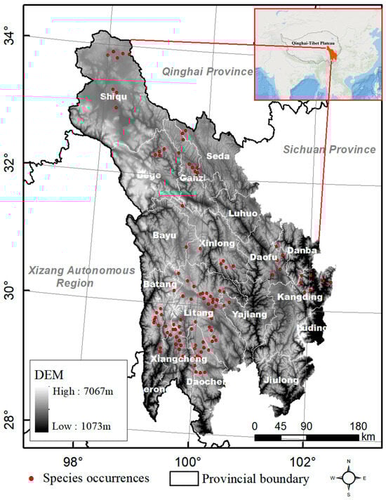 Ganzi Tibetan Autonomous Prefecture (approximately 149,700 km2) is one of the regions with the richest landscape types, ecosystem types, and biodiversity globally []. It not only harbors a vast number of ancient biological groups, but numerous new species have also evolved there. It is considered one of the most pristine areas in China in terms of native ecosystems, with the most intact natural vertical zones, and it is the most representative region of temperate ecosystems worldwide. As an important part of China’s “Three Rivers Source”, it is known as the “Water Tower of China” []. This region is home to numerous rivers and lakes, with a well-developed water system. The upper reaches of the Yangtze River, including the Jinsha River, the Yalong River, and the Dadu River, pass through 18 counties within the prefecture. The area boasts a variety of natural protected areas, including 83 sites across six categories: 44 protected areas, 11 forest parks, 17 wetland parks, 6 scenic spots, 3 geoparks, and 2 natural heritage sites. Ganzi Prefecture is rich in wild ecological resources, with 652 species of wildlife (including 98 national key protected species) and 5223 species of plants, making it an important natural gene pool for global species conservation (The People’s Government of Ganzi Tibetan Autonomous Prefecture; https://www.gzz.gov.cn/; accessed on 17 May 2024).