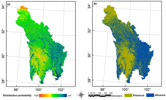 The MaxEnt model, based on the maximum entropy principle, is a widely used niche modeling approach in conservation biology research [,]. MaxEnt utilizes species presence data and environmental variables to estimate the most probable distribution of a species, simulating its current suitable habitat range and predicting future distributions under varying environmental conditions. This model relies solely on species presence data and environmental variables to simulate the current suitable distribution range of a species and to predict its potential future distribution []. In our study, we employed the MaxEnt model to simulate both the current and future distributions of the target species. Model parameters were set as follows: (a) 75% of the species occurrence points were randomly selected as training data for model development, while the remaining 25% were used as testing data for model validation; (b) the importance of environmental variables was evaluated through the Jackknife test method; and (c) model performance was assessed using a resampling method, with 15 repeated experiments to generate response curves, while other parameters were left at their default settings [,,]. The model’s performance was evaluated based on the receiver operating characteristic curve (AUC), where AUC values range from 0 to 1, with values closer to 1 indicating higher predictive accuracy []. The importance of each environmental variable in the model was quantified through percentage contribution. The logistic output from MaxEnt represents the probability of species occurrence, ranging from 0 to 1. To convert the continuous probability predictions of species presence into binary maps of suitable and unsuitable habitats, we calculated the mean threshold based on the maximum training sensitivity and specificity (MTSPS) []. Grids with probabilities exceeding this threshold were considered a suitable habitat. Furthermore, based on the species’ minimum home range threshold, unsuitable habitats with areas smaller than 10 km2 were excluded from the suitable habitat classification [].