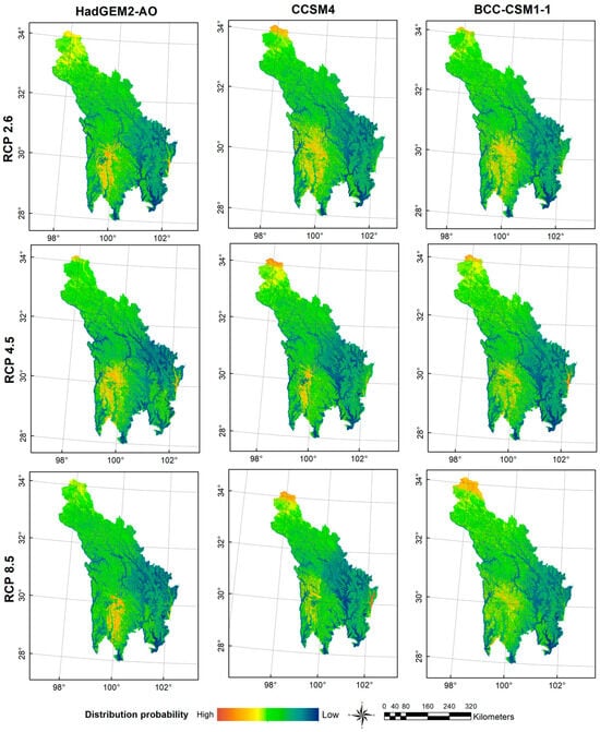 The distribution probability under future (scenarios of RCP 2.6, RCP 4.5, and RCP 8.5 in the 2070s) climate change scenarios.