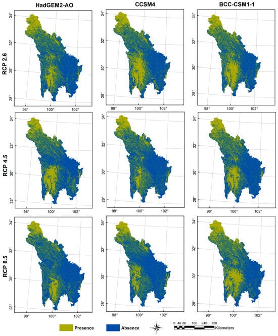 The binary distribution maps under the future (scenarios of RCP 2.6, RCP 4.5 and RCP 8.5 in 2070) climate change scenarios.