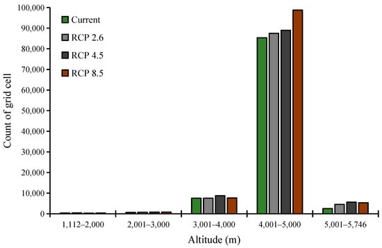 Under current climate conditions, suitable habitats in the study area were primarily concentrated in the 4001–5000 m elevation range, with relatively smaller areas of suitable habitats in the low-elevation ranges (1112–2000 m and 2001–3000 m), especially in the 1112–2000 m range. Under future climate scenarios, the distribution of suitable habitats was projected to undergo significant changes. Regardless of whether the scenario was RCP 2.6, RCP 4.5, or RCP 8.5, high-elevation areas (4001–5000 ms) remained the primary suitable habitat zones. However, with the intensification of climate change, the suitable habitat area in high-elevation regions showed a gradually increasing trend. In the RCP 2.6 scenario, the number of suitable habitat grid cells in the 4001–5000 m range increased to 87,532; in the RCP 4.5 scenario, this further increased to 88,954; and in the RCP 8.5 scenario, the suitable habitat area further grew to 98,741, reaching its maximum value. In contrast, the suitable habitat area in the low-elevation range (especially in the 1112–2000 m range) showed a marked reduction under future climate scenarios. As climate warming progressed, the altitude distribution of suitable habitats for species shifted upward (Figure 5).