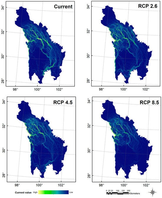 Under current climate conditions, the dispersal paths of the bears exhibited a northwest-to-southeast orientation, primarily concentrated in areas such as Dege, Ganzi, Xinlong, and Luho. The southern dispersal paths were more concentrated in areas including southern Yajiang, southern Kangding, southern Litang, and eastern Daocheng. By 2070, under all three emission scenarios, the dispersal paths of this species were projected to show an increase in dispersal resistance, a decrease in the density of dispersal paths, and a reduction in the connectivity of these paths. Specifically, under the RCP 2.6 scenario, the dispersal path density in the central region of the study area significantly decreased and dispersal resistance increased, with the dispersal paths in the southern part of Litang being almost entirely lost. Under the RCP 4.5 scenario, the dispersal paths became narrower, the length of dispersal corridors decreased, and the paths extended northward, with the southern dispersal paths largely disappearing. In the RCP 8.5 scenario, the southern dispersal paths were completely lost, and the overall dispersal paths gradually contracted toward the northwest, with the paths being primarily concentrated in the counties of Ganzi, Baiyu, and Dege (Figure 6).