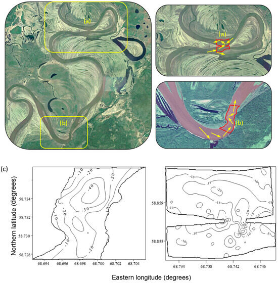 Location of the studied areas of wintering riverbed depressions in the Lower Irtysh: (a) Ukinskaya; (b) Gornoslinkinskaya. The red outline schematically shows the boundaries of the studied water areas; arrows schematically indicate the direction of the current. (c) Relief map of the bottom surface of the deep-water part of the Gornoslinkinskaya (left) and Ukinskaya (right) wintering riverbed depressions during the flood period.