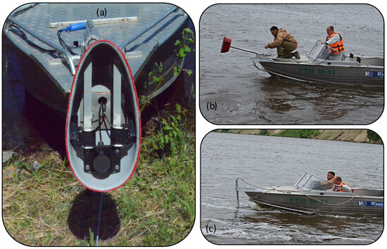 Installation of the antenna-emitter of the “AsCor” hydroacoustic complex on a small craft. (a) Location of the antenna-emitter with vertical view in a fairing in the bow of the small craft for conducting echo survey. (b) Small craft with installed fairing containing the antenna-emitter for transportation. (c) Small craft with installed fairing containing the antenna-emitter for echo survey.