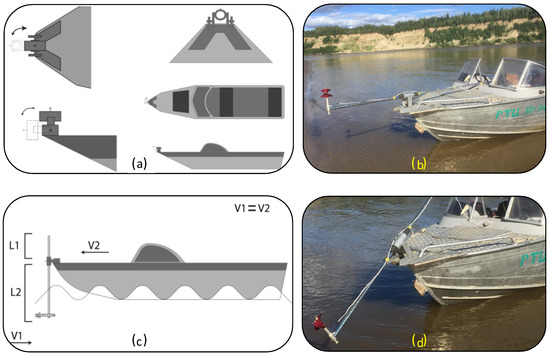 Diagram of installing a flow velocity meter on a small craft and the process of conducting a hydrometric survey. (a) Scheme of installing a metal rotary-extendable device in the bow of the small craft for transporting the flow velocity meter and conducting hydrometric measurements. (b) Small vessel with an installed flow velocity meter for transportation. (c) Scheme of conducting a hydrometric survey (L1—part of the metal rod above the small craft ’s side; L2—part of the metal rod below the small craft ’s side; V1—river flow velocity; V2—small craft speed). (d) Changing the position of the flow velocity meter for conducting a hydrometric survey.