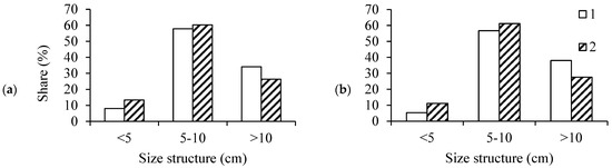 Size structure of fish in the areas of riverbed depressions: (a) Ukinskaya; (b) Gornoslinkinskaya. Graph bars 1 (in White)—Flood (30 May 2022) and 2 (Hatched)—low water period (31 July 2022).