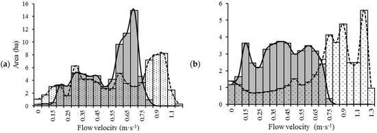 Dynamics of areas with different flow velocities in (a) Ukinskaya riverbed depression and (b) Gornoslinkinskaya riverbed depression during the flood period (white, dotted line) and low water period (gray, solid line).