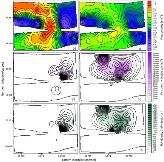 Horizontal projections of the distribution of velocity zones and juvenile fish in the studied water areas were performed using Surfer 9.0 software (Golden Software, Golden, CO, USA), with the geostatistical interpolation Kriging method [33,35], widely used in fishery and ecological research [36,37,38]. Preliminary calibration of the maps of the studied water areas was performed in the MapViewer 10.0 application, using imported satellite images of the area from Google Earth Pro 6.3. Analysis of the correlation (Pearson correlation coefficient) between fish distribution and zones of different velocity areas was performed using Statistica 10.0 software (StatSoft Inc., Tulsa, OK, USA). The normality of the data distribution was preliminarily determined (Kolmogorov–Smirnov and Shapiro–Wilk tests).