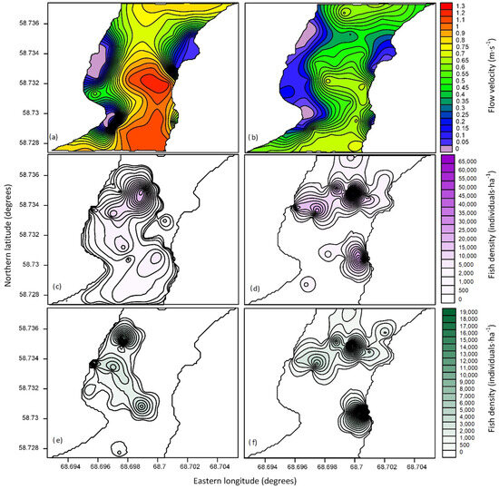 Distribution of flow velocity fields and fish fry (<10 cm) in the Gornoslinkinskaya riverbed depression during the spring–summer flood and summer–autumn low water period. (a) Flow velocities on 31 May 2022 and (b) 30 July 2022. Distribution of cyprinids on (c) 31 May 2022 and (d) 30 July 2022. Distribution of percids on (e) 31 May 2022 and (f) 30 July 2022.