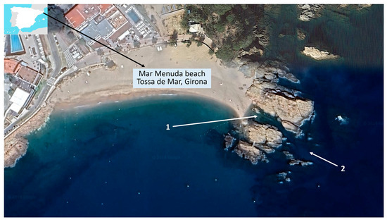 Location of Tossa de Mar on the Iberian Peninsula, showing La Banyera de ses Dones (1) and the sampling site (2).