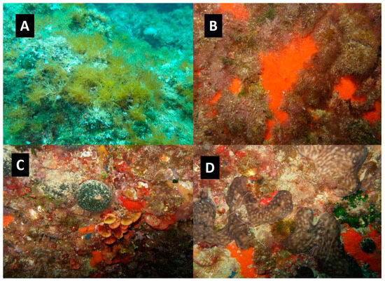 At depths between 1.5 and 3 m, the sciophilous wall is dominated by photophilous algae, including Osmundea pinnatifida, Ellisolandia elongata (J. Ellis and Solander) K.R. Hind and G.W. Saunders, 2013, Padina pavonica, and some thalli of Codium vermilara (Olivi) Delle Chiaje, 1829. Additionally, the community includes the unicellular green alga Acetabularia acetabulum (Linnaeus) P.C. Silva, 1952, cirriped crustaceans of the genus Semibalanus balanoides (Linnaeus, 1767), sea urchins (Arbacia lixula (Linnaeus, 1758)), and sponges such as Sarcotragus fasciculatus (Pallas, 1766). At depths of 3 to 4 m, the wall becomes slightly more sciophilic (Figure 3B) with abundant fronds of Halopteris scoparia, the red algae Peyssonnellia squamaria (S.G. Gmelin) Decaisne ex J. Agardh, 1842, and the brown algae Dictyota dichotoma. Here, red encrusting sponges (Crambe crambe Schmidt, 1862) and some Sarcotragus fasciculatus are also observed. From 5 to 6 m (Figure 3C), calcareous algae such as Mesophyllum lichenoides (J. Ellis) Me. Lemoine, 1928, the red alga Sphaerococcus coronopifolius Stackhouse, 1797, as well as hydrozoans of the genus Eudendrium, become abundant. Scattered thalli of Halimeda tuna (J. Ellis and Solander) J.V. Lamouroux, 1816, the red algae Halopteris scoparia and Peyssonnelia squamaria (S. G. Gmelin) Decaisne ex J. Agardh, 1842, some thalli of Codium bursa (Olivi) C. Agardh, 1817, the sponge Crambe crambe, and the zoantharian cnidarian Parazoanthus axinellae (Schmidt, 1862) are also present. From depths of 7 to 8 m down to the bottom of the wall (11 m) (Figure 3D), the alga Flabellia petiolata predominates, with abundant polychaete spirorbids growing on its fronds. The community also includes encrusting calcareous algae, Peyssonnelia squamaria, Parazoanthus axinellae, the sponges Phorbas tenacior (Topsent, 1925), Petrosia (Petrosia) ficiformis (Poiret, 1789), Chondrosia reniformis Spikenard, 1847 and Clathrina clathrus (Schmidt, 1864), as well as serpulid polychaetes like Serpula vermicularis Linnaeus, 1767.