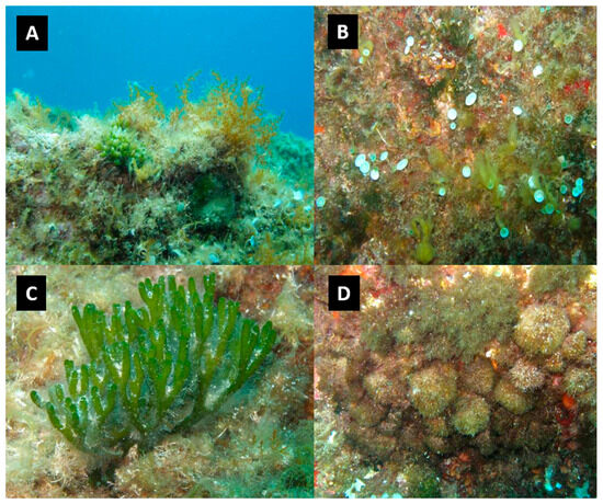 Algal community in the photophilic wall. (A): Osmundea pinnatifida; (B): Acetabularia (Acetabularia) acetabulum; (C): Codium vermilara; (D): Halopteris scoparia. Photos by M. Ballesteros.