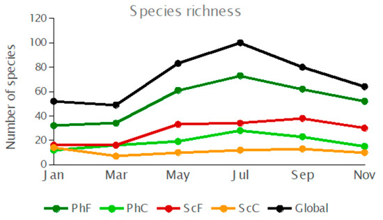 Species richness throughout the year. “Ph” and “Sc” indicate the photophilous and sciophilous communities, respectively, while “F” refers to the fine fraction and “C” to the coarse fraction.