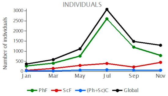 The number of individuals collected throughout the year. “Ph” and “Sc” indicate the photophilous and sciophilous habitats, respectively, while F refers to the fine fraction and C to the coarse fraction. Due to the low number of specimens in the coarse fraction, individuals from both habitats are grouped together.