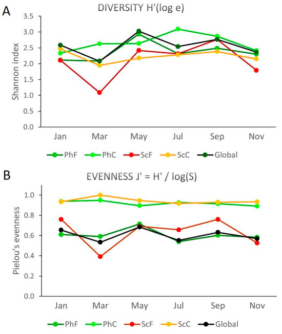 Shannon diversity index (A) and Pielou’s evenness (B) throughout the year. “Ph” and “Sc” refer to the photophilous and sciophilous habitats, respectively, while “F” refers to the fine fraction and “C” to the coarse fraction.