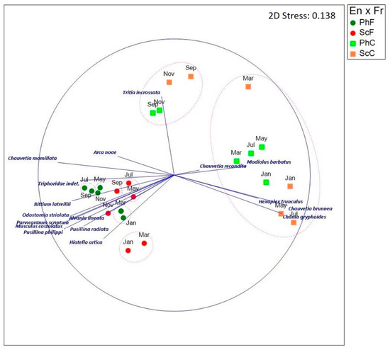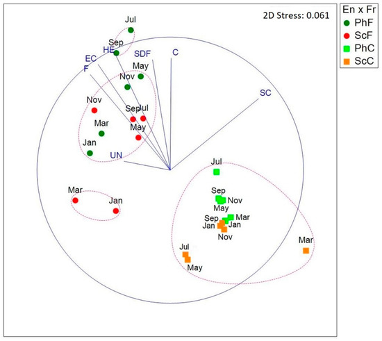 Based on these findings, a SIMPER analysis was conducted to examine the En x Fr groups (i.e., PhF, PhC, ScF, and ScC) and months (Table 2 and Table A3). The results show clear differences between groups (environments and fractions) and across months.