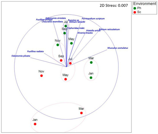 NMDS representation of fine fraction data. Clusters are represented by ellipsoids and have been obtained by applying the UPGMA method and checking significant branches with the SIMPROF test (α = 5%). “Ph” and “Sc” indicate photophilous and sciophilous habitats, respectively. The segments represent the correlation between species and axes, with the circle delimiting the maximum correlation (−1 to 1). For each environment and month, species contributing at least 5% to the similarity (based on SIMPER analysis) were selected.