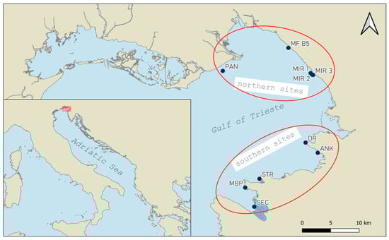 The Gulf of Trieste, located in the northernmost part of the Adriatic Sea, has historically harboured one of the densest populations of P. nobilis [,,] and was one of the last areas to be affected by the MME, with the first detection in 2019 []. For these reasons, the Gulf was selected as a pilot area for restoration actions within the LIFE Pinna project “Conservation and restocking of the Pinna nobilis in the western Mediterranean and Adriatic Sea” (LIFE20NAT/IT/001122 LIFE PINNA).