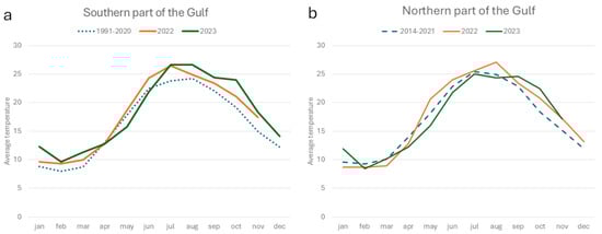 (a) Average monthly temperature (°C) in the southern sites (Slovenia): data of surface waters from Mareographic Station in Koper from ARSO 2022−2023. (b) Average monthly temperature in the northern sites (Italy): data of surface waters from ARPA FVG 2022−2023.