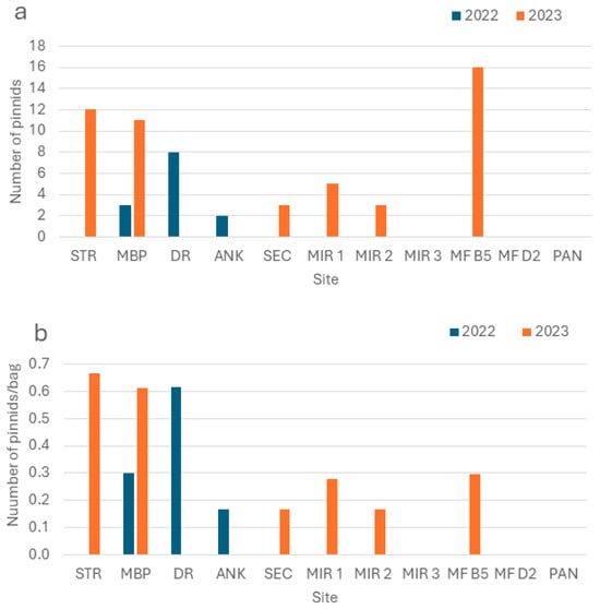 Total number of pinnids (a) and number of live pinnids per bag (b) found in collectors at different sites in 2022 and 2023.