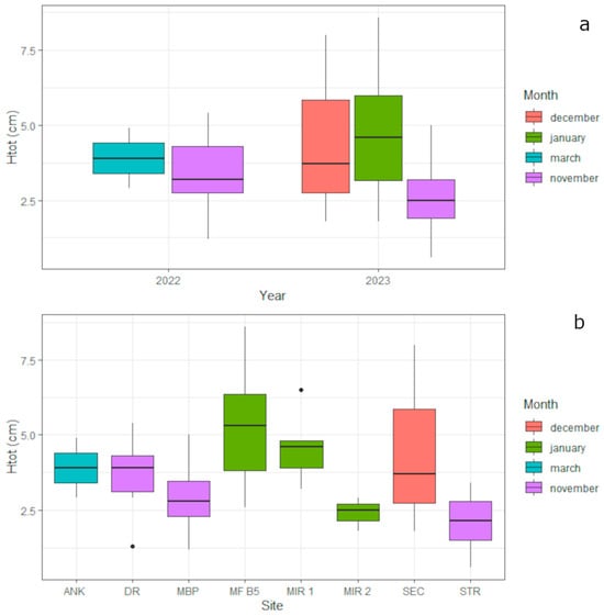 The size of pinnids (Htot) did not significantly differ from 2022 to 2023 (KW, p > 0.05, Figure 4a), even when considering only pinnids collected in the same month (November, KW, p > 0.05), but it differed significantly among sites (KW, p < 0.05). In particular, the size was significantly higher in collectors installed on mussel farms than in other collectors (post hoc, p < 0.05), in particular at sites MBP and STR (post hoc, p < 0.05), where the individuals were smaller (Figure 4b). This variation could be related to the month of collection; in fact, collectors at MF B5 were checked in January, while those at sites MBP and STR were collected in November (Figure 4b). Nevertheless, some differences among sites were observed also for collectors checked in the same month. The recruits found in collectors at site MF B5 were larger than at site MIR 2, both of which were checked in January (post hoc, p < 0.05, Figure 4b), and the recruits at site DR were bigger than at site STR, both of which were checked in November (post hoc, p < 0.05, Figure 4b).