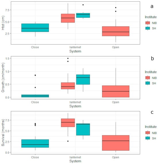 Boxplots showing variability of (a) pinnids’ size (Htot), (b) pinnids’ average monthly growth and (c) pinnids’ survival in different controlled growth system. Colours represent the institute in change in the activity (red = NIB, Piran, blue = Shoreline, Miramare MPA).
