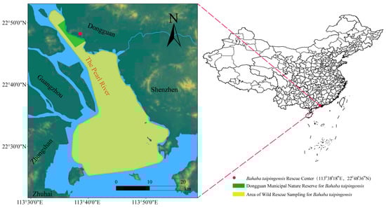 Geographic locations of B. taipingensis wild sampling and conservation sites in the Pearl River Estuary. The yellow polygon marks the area of wild rescue sampling, and the green polygon indicates the Dongguan Municipal Nature Reserve for B. taipingensis. The red dot represents the B. taipingensis Rescue Center (113°38′18″ E, 22°48′36″ N), where broodstock maintenance and F1 breeding were conducted. Major geographic landmarks are shown in black and the main river channel (The Pearl River) is highlighted in brown.