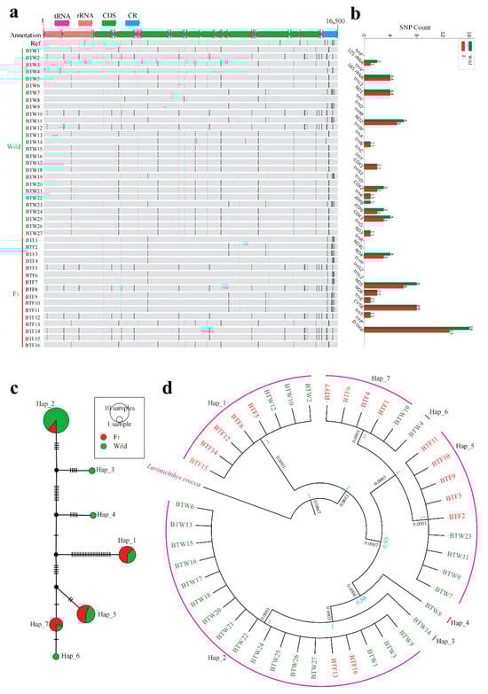 Mitochondrial genome variation and maternal lineage structure of the wild population and the F1 cohort. (a) SNP distribution across the mitochondrial genome. Each black vertical line represents a SNP. Wild individuals (BTW1–27) are shown in green, F1 individuals (BTF1–16) in red. Genomic features include tRNA, rRNA, CDS, and the control region (CR). (b) Comparison of SNP counts across mitochondrial functional regions between the wild population and the F1 cohort. (c) Median-joining haplotype network based on mitochondrial sequences (excluding the D-loop). Circle size reflects haplotype frequency; colors denote group origin (green = wild, red = F1). (d) Phylogenetic tree inferred from mitochondrial sequences (excluding the D-loop) using Bayesian inference. Larimichthys crocea served as the outgroup. Node values indicate Bayesian posterior probabilities (blue); the black number represents the genetic distance at the basal divergence between the outgroup and the ingroup.