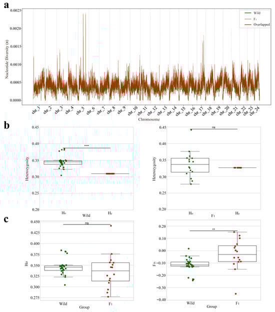 Nuclear genomic diversity and population genetic structure in the wild population and the F1 cohort. (a) Sliding window analysis of nucleotide diversity (π) along each chromosome (window size: 100 kb; step size: 10 kb). The wild population and the F1 cohort are shown in green and red, respectively, with overlapping regions indicated in dark brown. (b) Comparison of Ho and He within each group. Statistical significance is indicated as follows: ns = not significant (p > 0.05); ** = p < 0.01; **** = p < 0.0001. (c) Between-group comparisons of Ho and FIS. Significance levels follow the same notation as in panel (b).