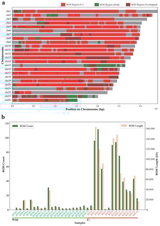 Comparison of the ROH patterns between the wild population and the F1 cohort. (a) Genomic distribution of ROH regions across 24 chromosomes. ROH regions specific to wild individuals (BTW1–27) are shown in red, those specific to F1 individuals (BTF1–16) in green, and overlapped ROH regions shared by both groups are marked in brown. Each chromosome is shown as a horizontal bar scaled to its actual length. (b) ROH statistics for each individual, including the number of ROH segments (green bars, left y-axis) and total ROH length (pink bars, right y-axis). Wild individuals are labeled in green (BTW1–27) and F1 individuals in red (BTF1–16).