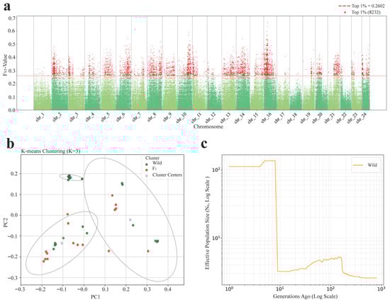 Genome-wide population differentiation and structure of the wild population and the F1 cohort. (a) Manhattan plot of genetic differentiation (FST) between the wild population and the F1 cohort. Red dots represent loci in the top 1% of FST values and the red dashed line indicates the threshold (FST = 0.2602). (b) Principal component analysis (PCA) with K-means clustering (K = 3). Points represent individuals, with ellipses indicating 95% confidence intervals. (c) Ne trajectories of the wild (orange) and F1 (blue) groups, inferred from linkage disequilibrium. Left: long-term dynamics on a log scale.