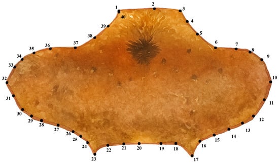 Dorsal view of the pronotum of Acanthocephala species showing the distribution of 40 landmarks along its contour.