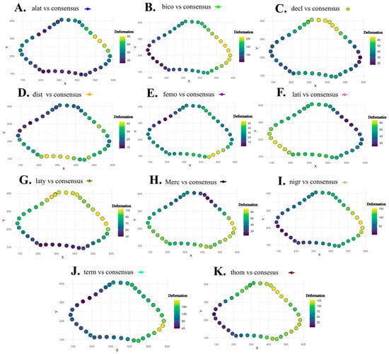 Comparison of the mean pronotum shapes of the 11 evaluated species with respect to the general consensus of the genus Acanthocephala. Each panel (A–K) shows the deviation of a species’ mean pronotum shape from the overall morphological consensus derived from the complete dataset. Circles represent landmarks, and the color scale indicates the magnitude of Procrustes deviation at each anatomical point, ranging from lower to higher distances from the consensus.