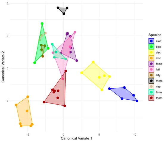 The canonical variate analysis (CVA) revealed a clear morphological differentiation among the evaluated species based on pronotum shape (Figure 5). The species alat, decl, dist, merc, and thom exhibited marked shape separation, demonstrating distinctive patterns compared to the other species. In contrast, species such as bico, femo, latí, laty, nigr, and term showed a higher degree of shape overlap, indicating morphological similarities in the pronotum. These differences were statistically significant following the permutation test using Mahalanobis distances (Table 2).