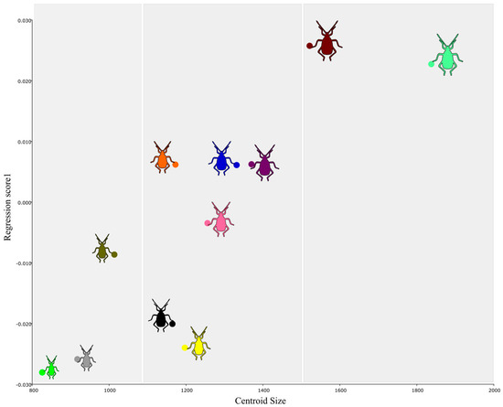 The multivariate regression of centroid size on pronotum shape revealed a weak allometric effect, explaining only 4% of the total shape variation (Figure 6). At the interspecific level, significant differences in average pronotum size were observed: thom and term displayed the largest pronota; alat, dist, lati, femo, decl, and merc showed intermediate-sized pronota; while bico, nigr, and laty exhibited the smallest pronota.