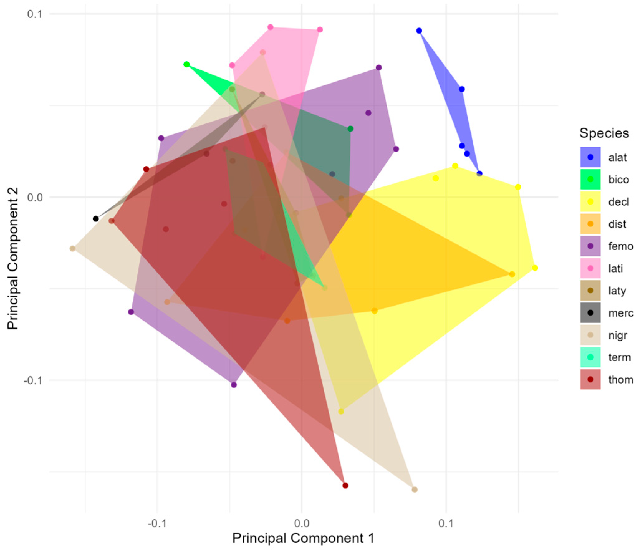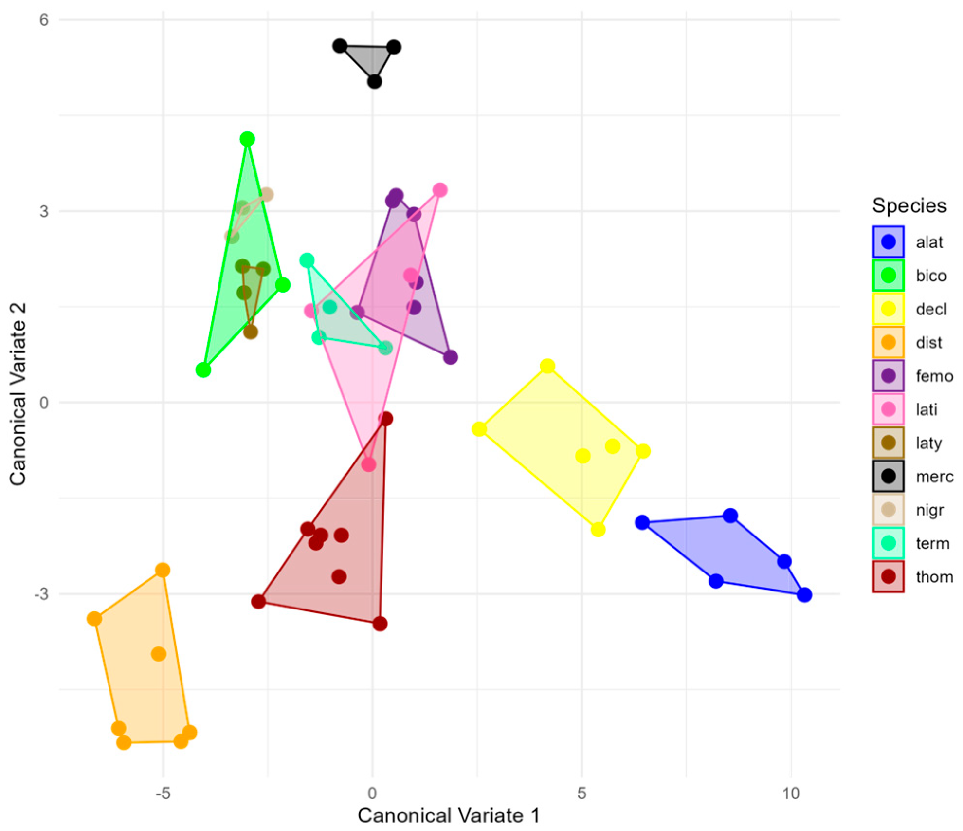 - Smith-Pardo, A.H.; Lingafelter, S.W.; Laroze, D.; Piñeiro-Gonzalez, A.; Benítez, H.A. Shape as a Key to Taxonomy: Morphometric Analysis of Tetropium Species (Coleoptera: Cerambycidae). Insects 2025, 16, 386. [Google Scholar] [CrossRef]