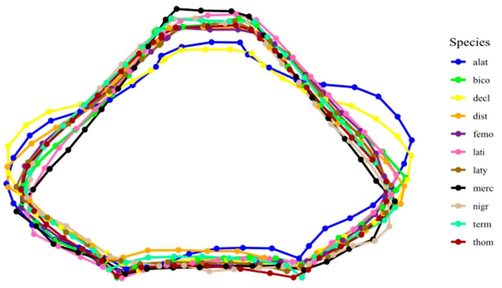 - Adams, D.C.; Otárola-Castillo, E. Geomorph: An R package for the collection and analysis of geometric morphometric shape data. Methods Ecol. Evol. 2013, 4, 393–399. [Google Scholar] [CrossRef]