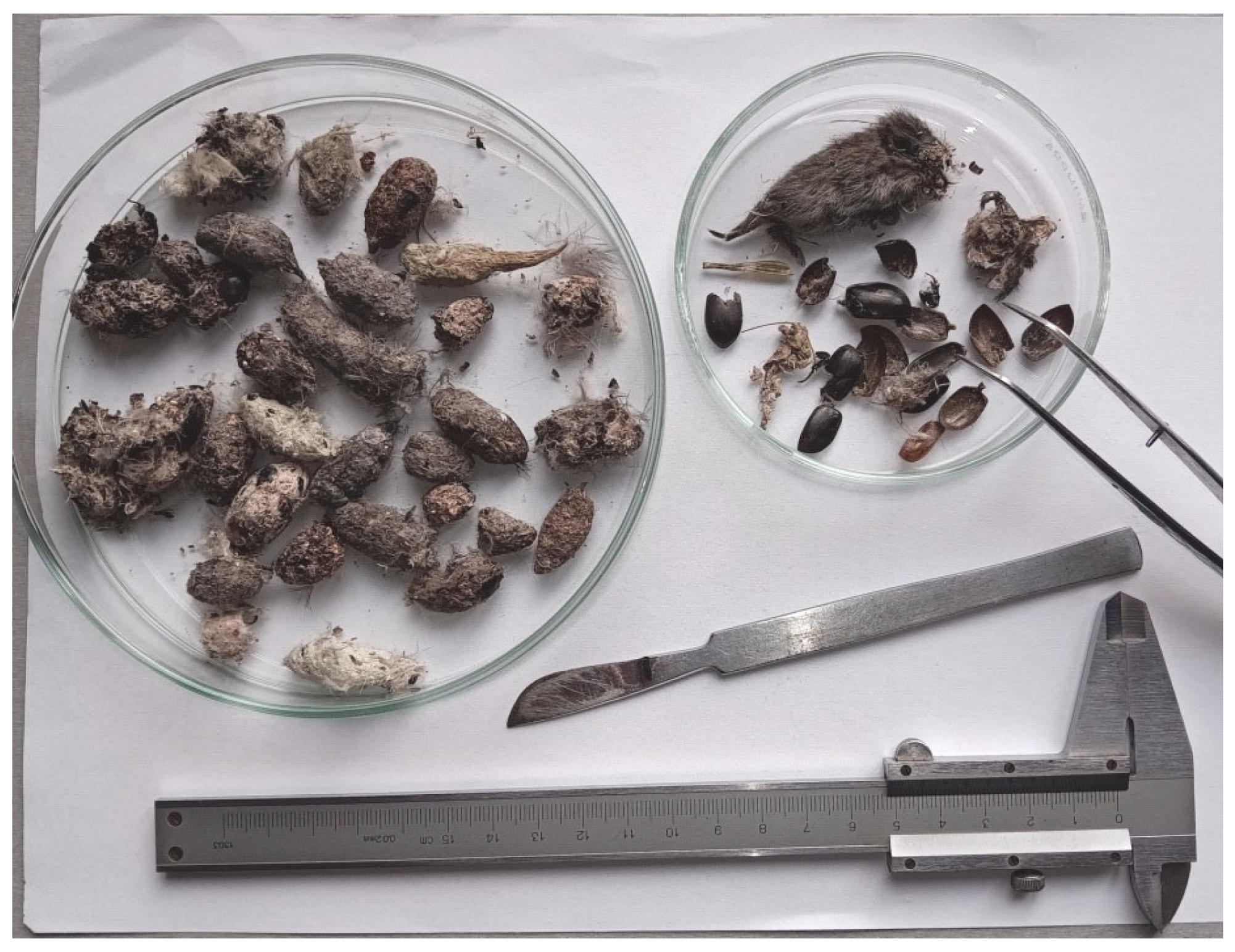- Mikula, P.; Karg, J.; Jerzak, L.; Walasz, K.; Siekiera, J.; Czyż, S.; Mikicińska, K.; Pietkiewicz, M.; Hanna, S.; Jakub, W.; et al. Diet analysis and the assessment of plastic and other indigestible anthropogenic litter in the White Stork pellets. Environ. Sci Pollut. Res 2024, 31, 6922–6928. [Google Scholar] [CrossRef] [PubMed]