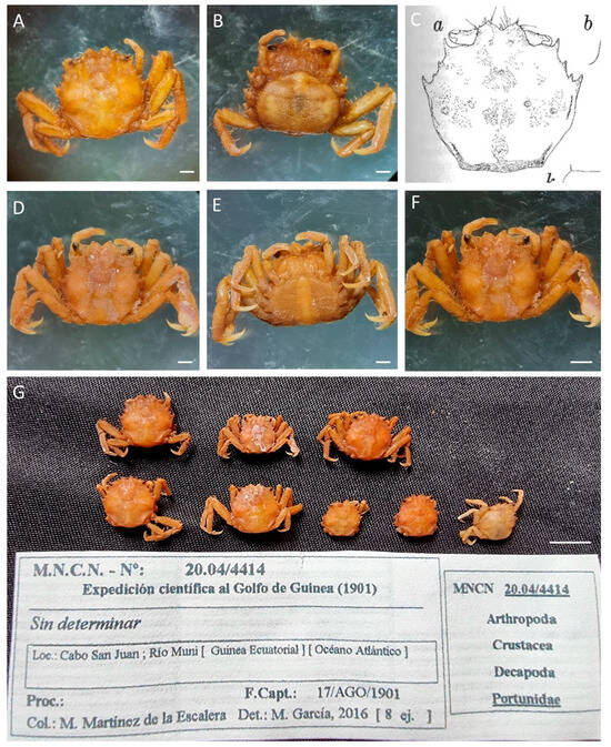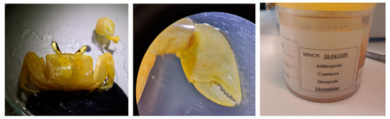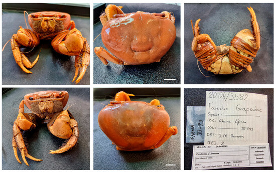 The Arthropod collection of the MNCN contains 1302 decapod specimens from African marine waters, among these, the Thoracotremata are represented by specimens from seven countries, including specimens from the Canary Islands (Spain). As was pointed out in the first part of this study [3], many important collectors collaborated in the collections or donations of the specimens housed in the MNCN such as Félix Édouard Guérin-Méneville, Manuel Martínez de la Escalera, Emilio Rolán, or Émile Deyrolle.