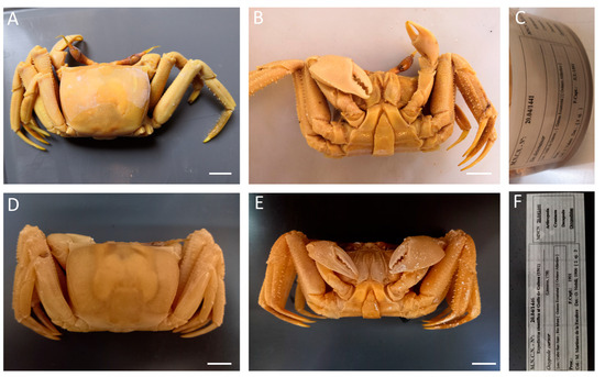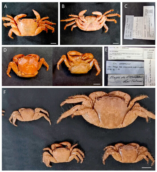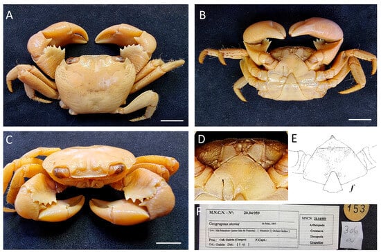 (A–C) Geograpsus grayi, from Mauritius, MNCN 20.04/00959; (D) Pubescent second sternite; (E) drawing of the second sternite from Banerjee [18]; (F) old and posterior labels. Scale bars: 1 cm.